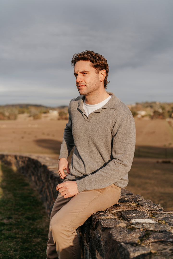 Merino Long Sleeve Polo- Grey